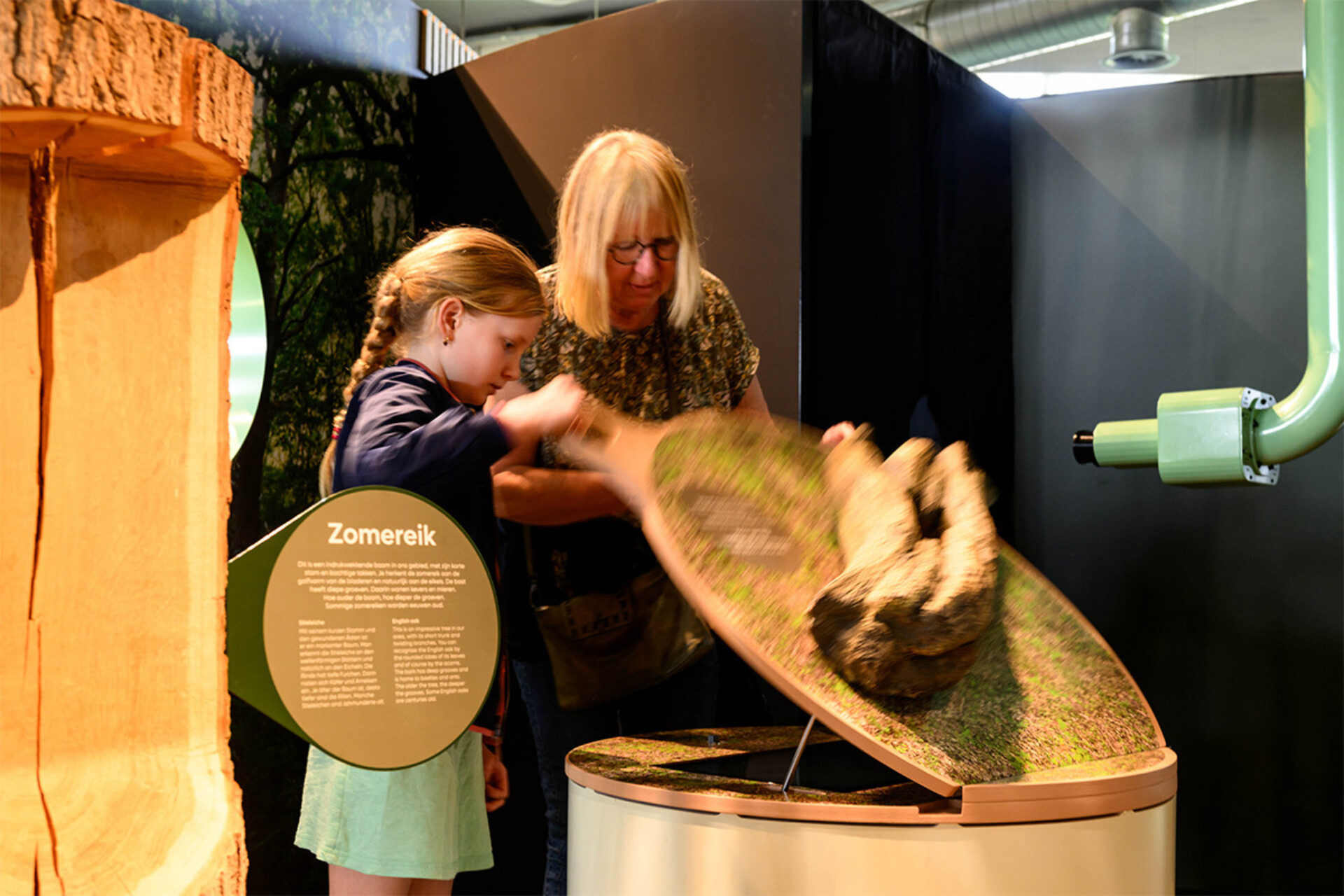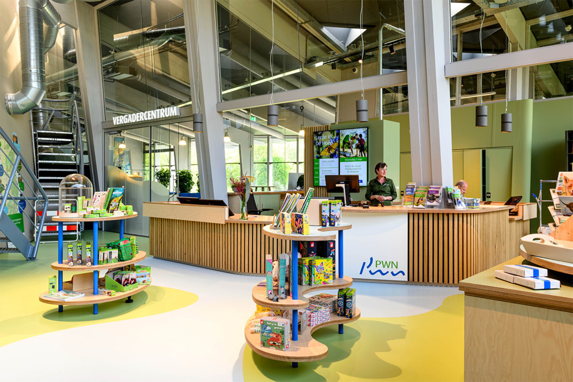 The counter and shop in the Visitor Centre combine three functions: welcoming visitors, selling products and sharing information. The natural materials and colours provide an inviting atmosphere and create a smooth transition between the entrance area and the permanent presentation.