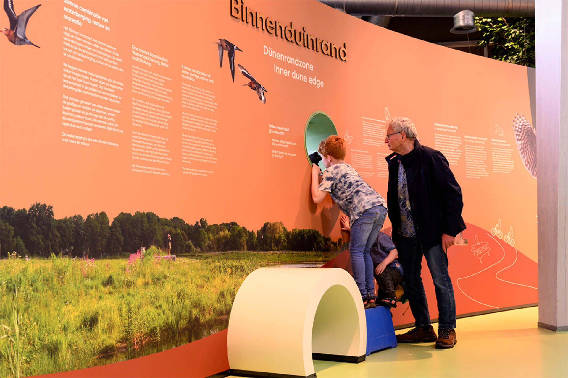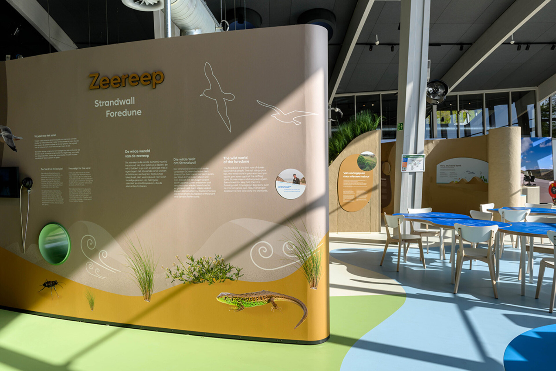 Inside the Visitor Centre, you encounter six different types of landscapes that you will also find at the North-Holland Dune Reservation. In each different landscape type, we learn about a main character that is featured in a ‘network framework’ – in which the landscape is presented in 3D.