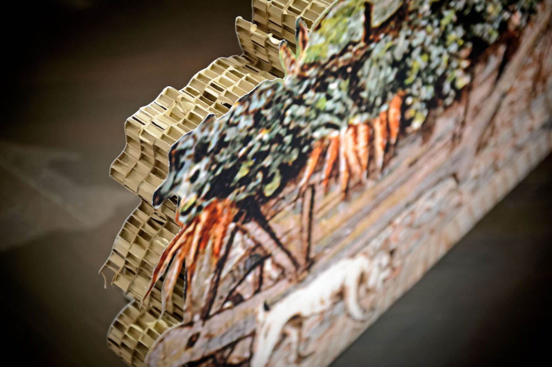 Magnified drawings are built as cardboard set pieces to enhance the illusion of an enormous shoe box diorama. The profile of the cardboard is visible at the edges of the set pieces.