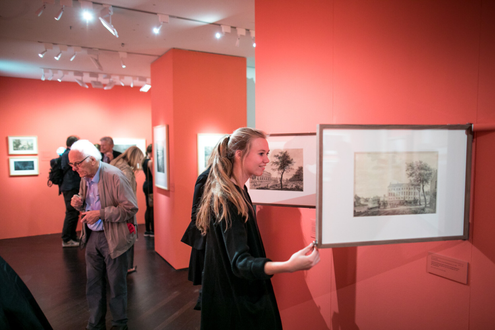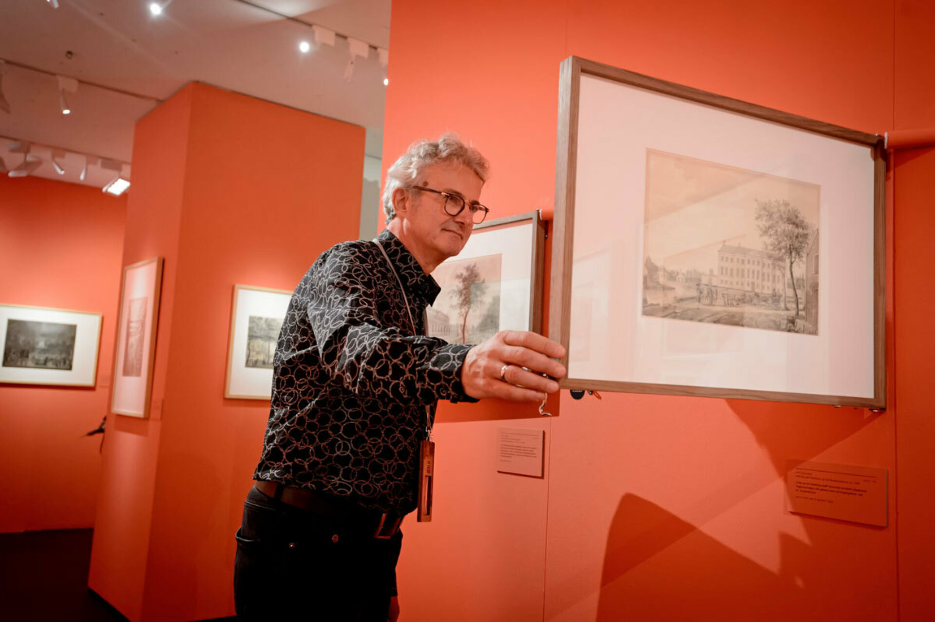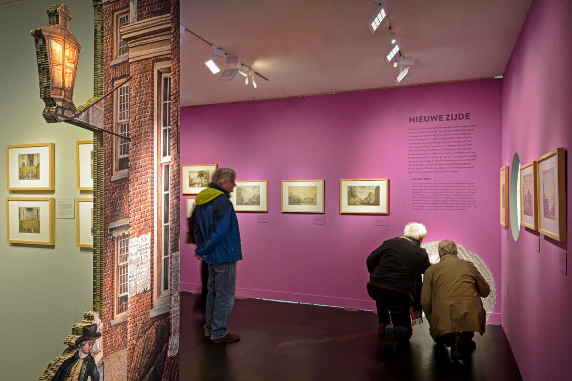 The detail in many of the drawings is so great that magnifying glasses must be used to study them. Tiny pamphlets on the walls can actually be read and tens of thousands of bricks are individually coloured. The drawings have been magnified up to a hundred times to do all these details justice. The maginifications are printed and placed in the exhibition, enabling visitors to walk through a diorama of city sights. The magnifications are combined with video footage of 2017 Amsterdam in lively animations, which are projected on a seven meter wide wall.