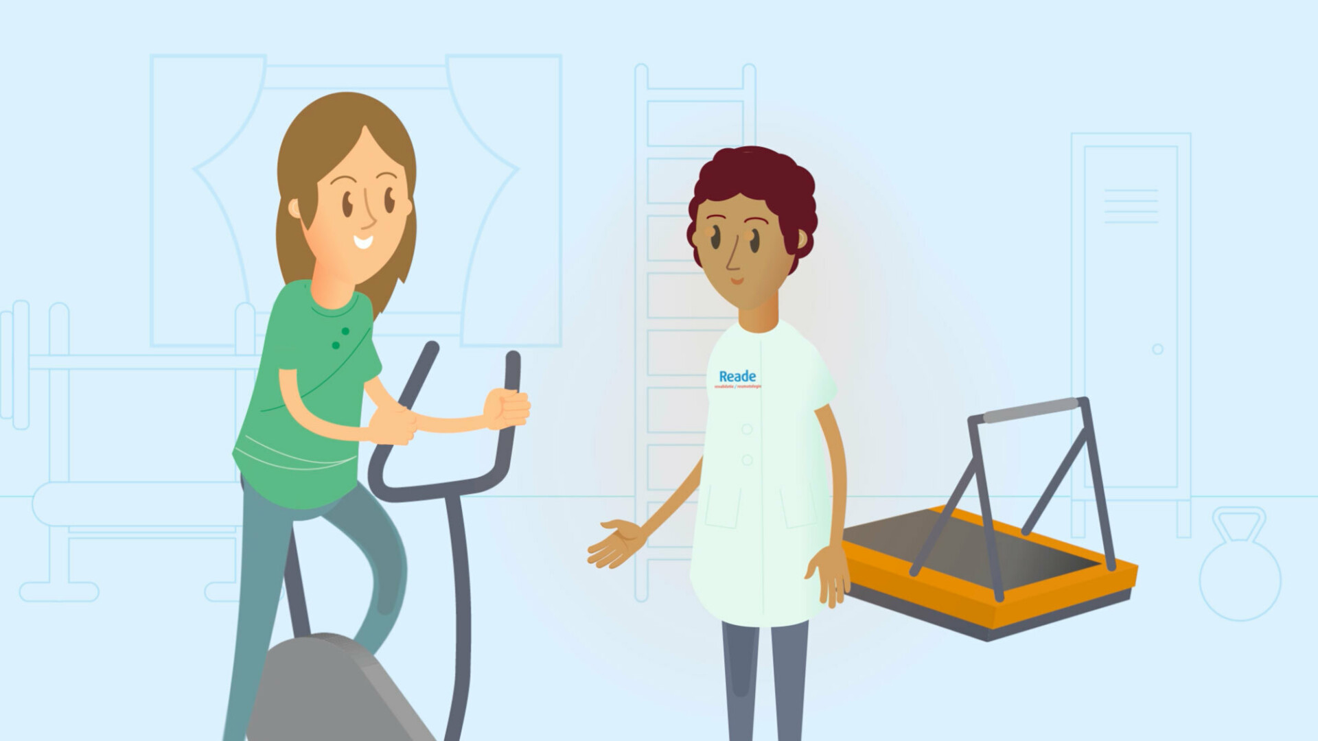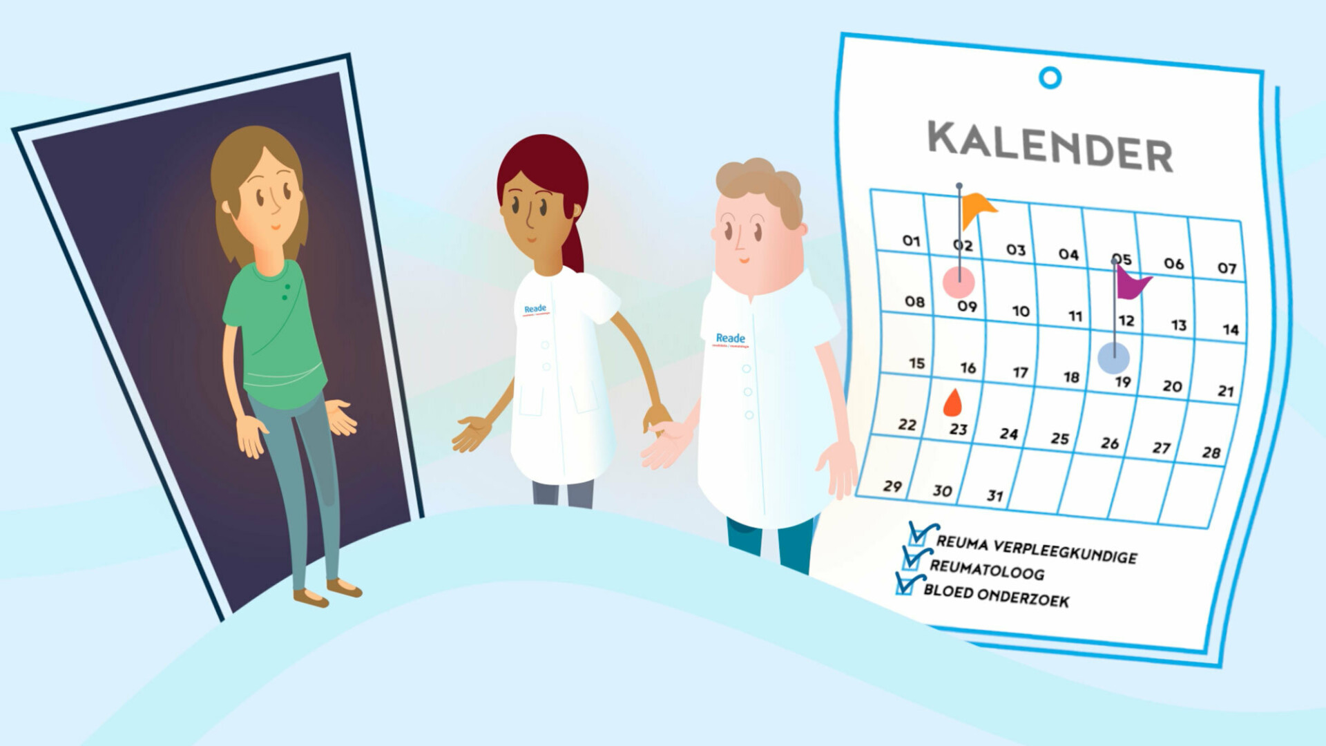 We developed a series of easy to follow animations to introduce patients to Reade’s care programs. Reade introduces itself in the animations and showcases its personal approach and vast body of specialised knowledge. The animations star a character who is confronted with the consequences of disease or injury, and who is helped by Reade and encouraged to take independent measures to increase her health. The animation are slow paced, information is conveyed in spoken word, written and with images.