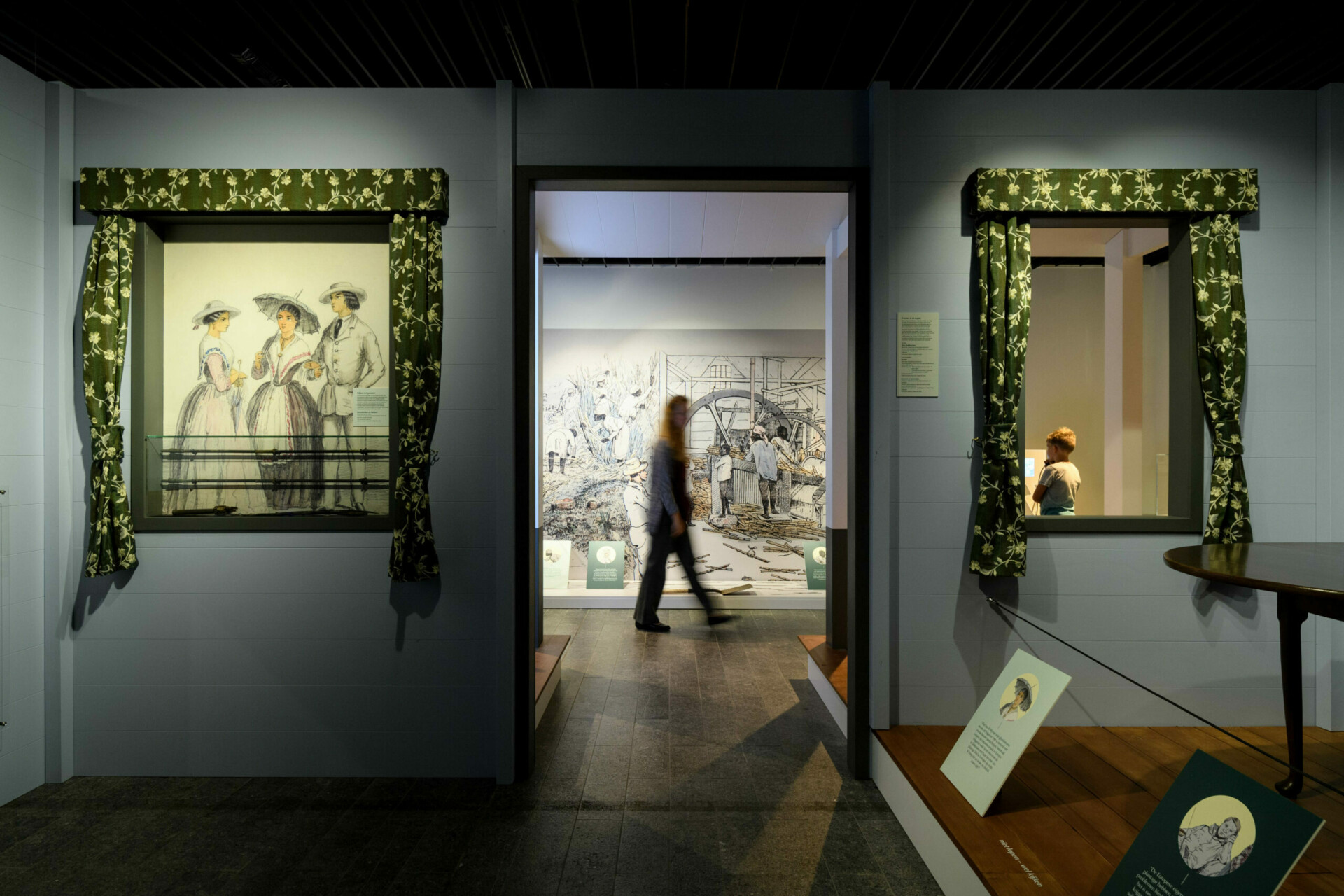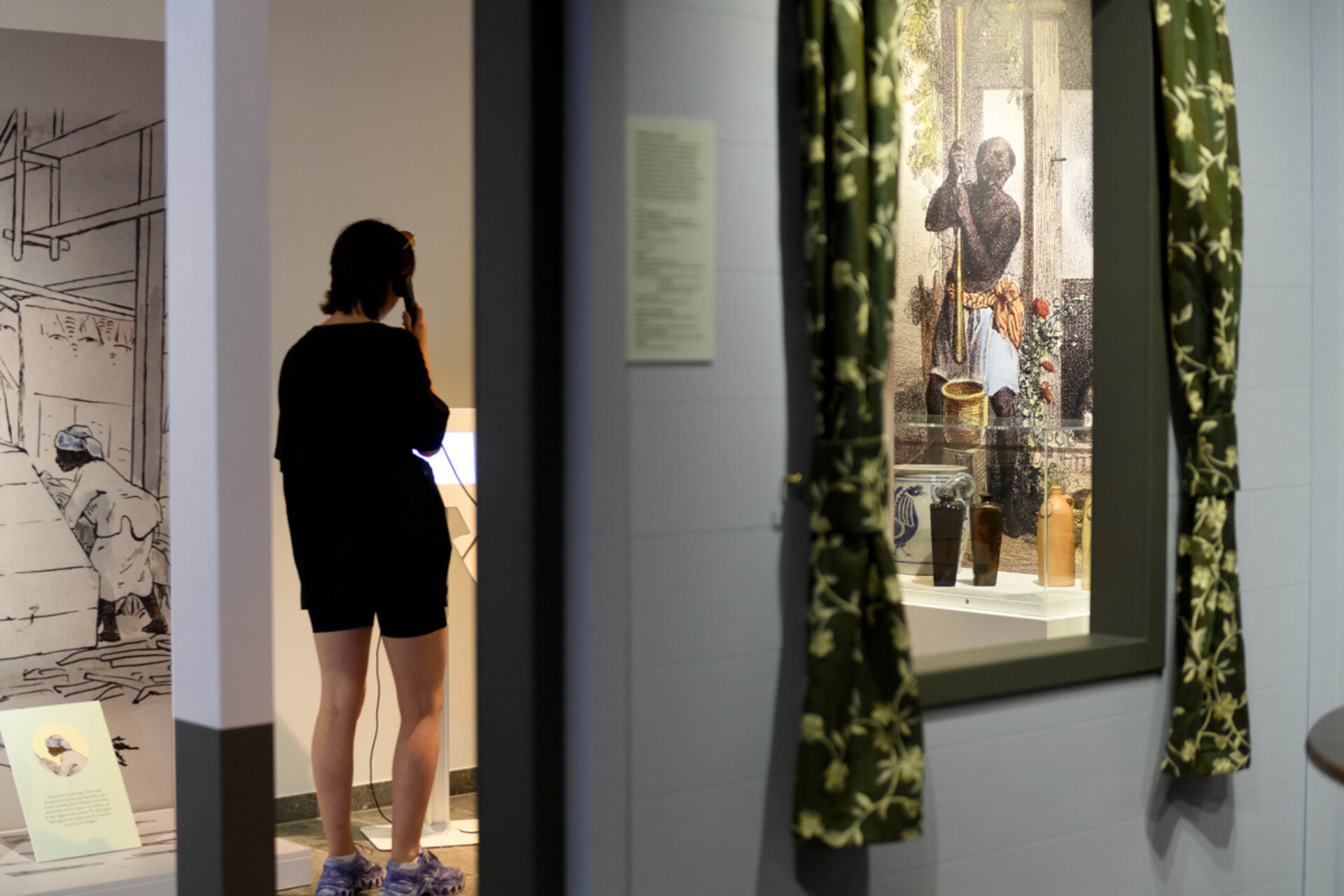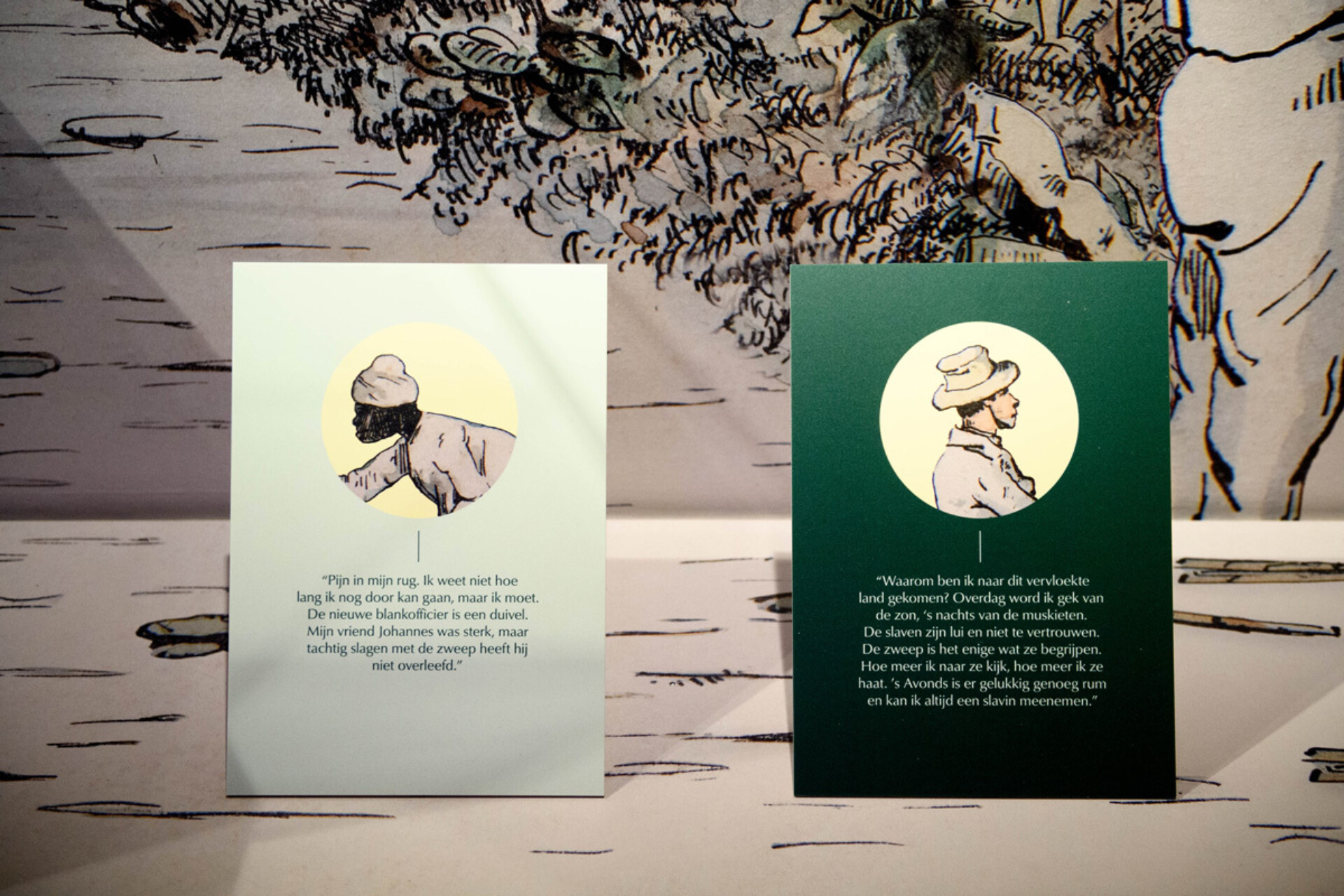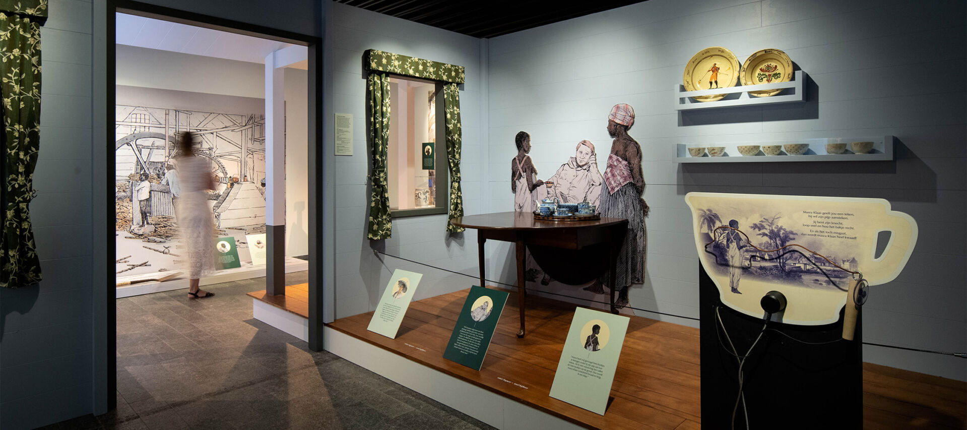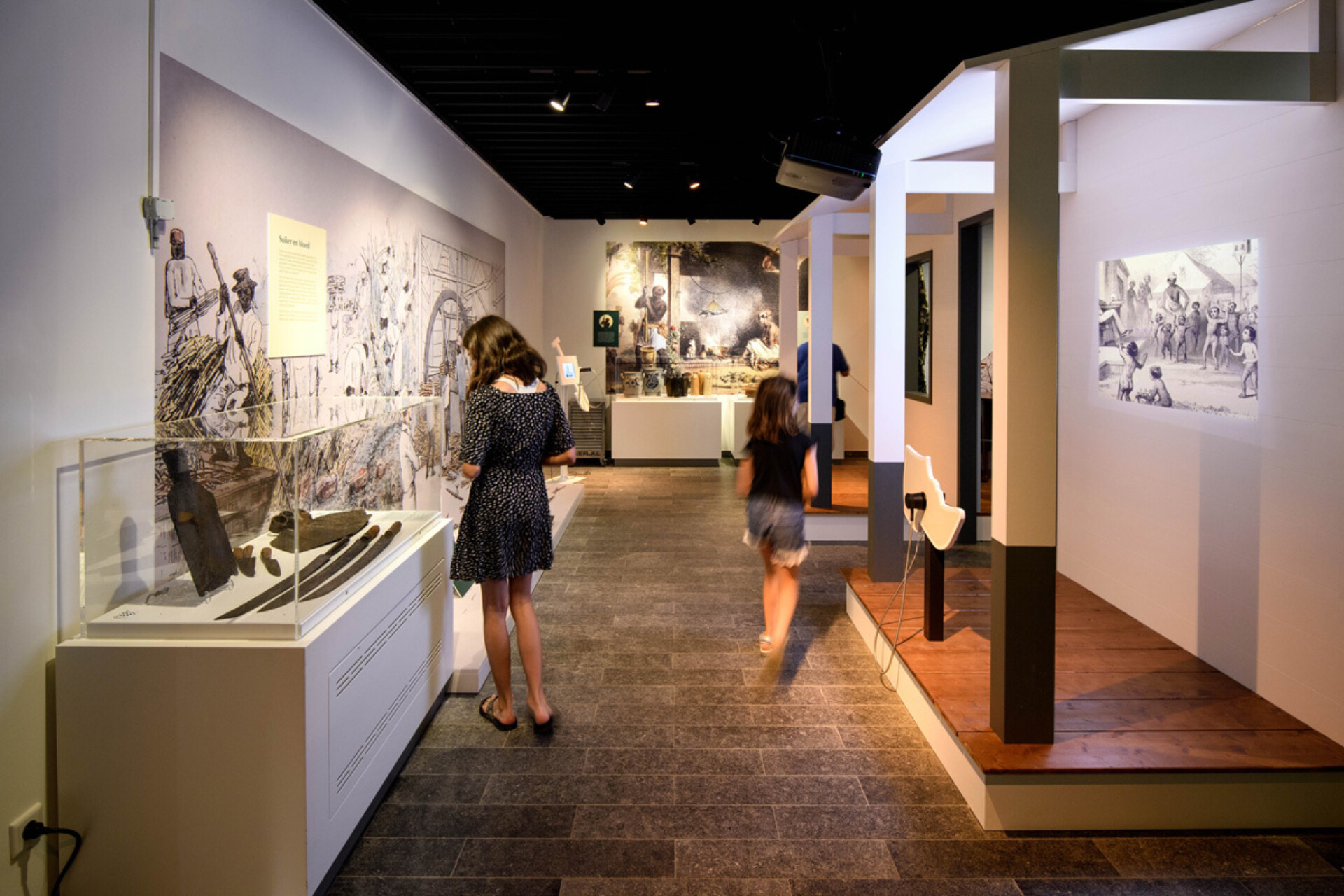 The exhibition highlights the stark and heart-breaking contrast between the hard work on the land and the rich life of the colonial mansions. The collection endorses this contrast.  Cleavers, machetes, hooks and shovels for use on the plantations lay between boxes full of richly decorated tableware, pipes and ornamental fittings for the luxurious life of the plantation owners. Contrary to what you would expect, the story in the exhibition starts with the slavery of the past and we do not go under water until the end.